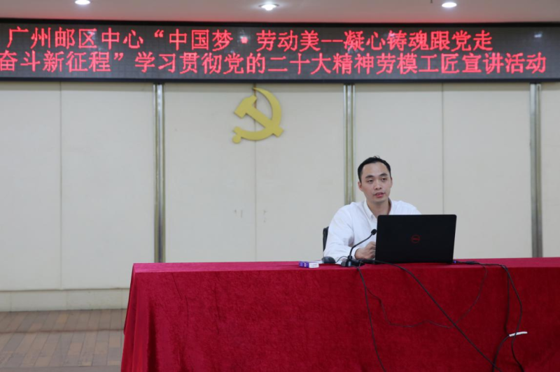 广州邮区中心副总经理、工会主席夏宇指出,组织开展劳模工匠宣讲活动,就是要身边的人说身边的事,以劳模自身的成长经历、付出的努力、取得的成绩,教育引导广大员工树立劳动最光荣、劳动最崇高、劳动最伟大、劳动最美丽的观念,使劳模精神内化于心、外化于行,直正入脑又入心。在企业内掀起宣传劳模工匠先进事迹、讲好新时代新职工在推动企业持续、有效、健康发展的奋斗故事,有利于激发广大职工在推进邮政企业高质量发展过程中的干劲和激情。