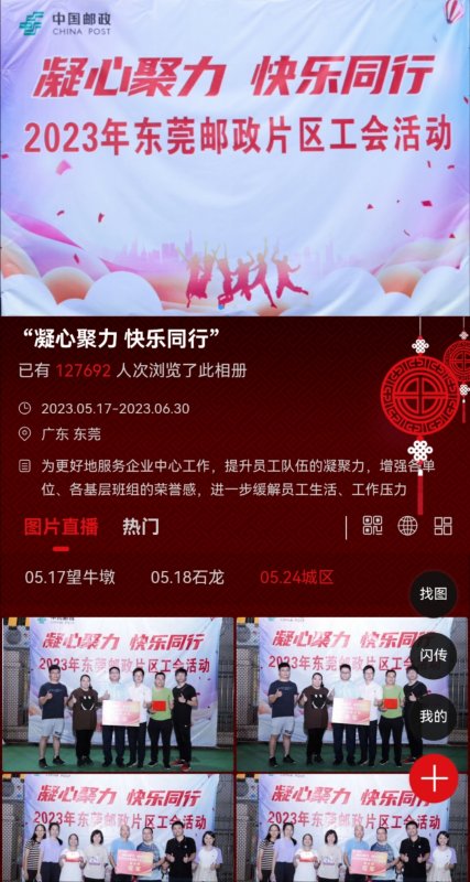 与此同时,东莞邮政工会借助平台进行了活动图片直播,为员工定格美好时光,留下欢乐回忆。截至5月24日第三场片区活动结束,直播相册浏览量已超10万人次。