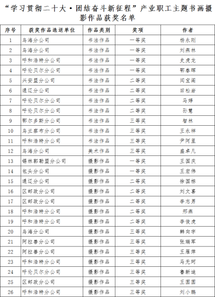 据悉,此次主办方共收到15个单位广大职工创作的372件书画摄影作品,经过层层推选和自治区专家评审,共评选出书法、美术、摄影作品79件。其中:内蒙古邮政工会选送的114件作品中共有6件被评为一等奖,9件被评为二等奖,11件被评为三等奖,并获“优秀组织单位”奖。