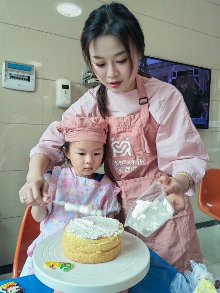 小朋友们在家长的协助下,认真地做着蛋糕。有的活泼的小朋友还将奶油点在脸上,有的嘴馋的小朋友偷偷地先吃上一口甜甜的蛋糕。在这次蛋糕制作活动中,小朋友们俨然成了一个个小小蛋糕师。