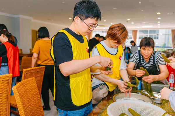 一把白糯米、一颗甜蜜枣,大家围在一起,有经验的同志现场教学,向大家讲解包粽子的技巧要领。大家按照步骤捋好粽叶,把粽叶折叠成漏斗状,装糯米、填红枣、封粽口、绑棉线,没过多久,一个个外形玲珑、鲜绿饱满的粽子就包好了。嗅着新鲜粽叶的清香,看着手中一个个结实充盈的粽子,参加活动的员工们满满的欣喜,满满的成就感。