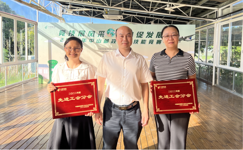 中山市分公司党委委员、副总经理、工会主席谢名亮为获奖队伍颁发奖项。同时,比赛现场还颁发了2022年度中山邮政先进工会分会、先进职工小家的荣誉奖项。