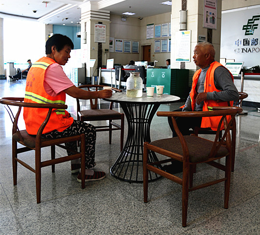亳州邮政芍花路营业所户外劳动者驿站环卫工人正在喝茶休息