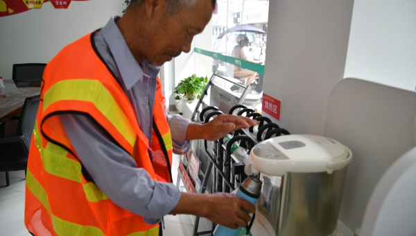 望江县邮政雷池路支局户外劳动者驿站环卫工人正在接热水
