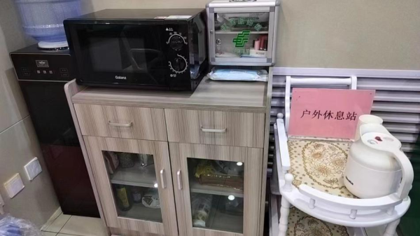 新建“邮爱驿站”配备了桌椅、饮水机、微波炉、应急药品、充电宝等设备和工具,能提供包括休息、手机充电、饮水、雨伞、应急外敷药品以及饭菜加热等服务,并安排有专人负责日常管理和维护工作。