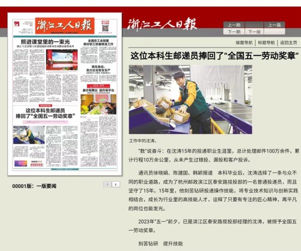 杭州市邮政工会积极和属地工会沟通,严格按照创先评优的民主流程进行推荐评选,滨江区分公司泰安路揽投部经理沈涛被认定为2021年杭州工匠,荣获2022年杭州市劳动模范、2023年浙江省劳动模范、2023年全国五一劳动奖章等荣誉称号;滨江泰安路揽投部荣获浙江省工人先锋号(班组)称号。《中国邮政报》《杭州日报》《浙江工人日报》头版、《杭州网络电视台》等媒体对先进事迹进行了立体化多角度全方位的报道,起到了较好的引领作用。