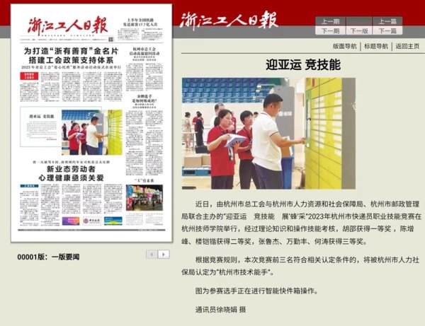 2022年受经信工会委托,杭州市邮政工会选拔5位选手代表杭州市总工会参加2022年浙江省快递员职业技能竞赛并包揽前三名,被浙江省总工会命名为浙江“金蓝领”称号。《中国邮政报》头版给予图文报道,极大地提升了企业的社会美誉度。