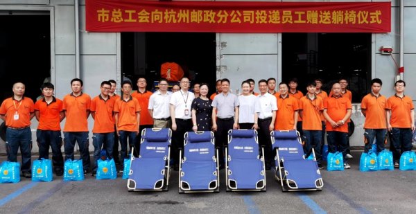 2021年,由杭州市经信工会发起、杭州市总工会主办、杭州市邮政工会承办的为期三年的“关爱投递人员、共建休息驿站”折叠躺椅捐赠活动提前一年完成, 2300张躺椅发放到杭州市143个邮政揽投网点、经营部和邮运驾驶组。上城区彭埠综合揽投站邮政快递小哥吴超深情地说:我们来自五湖四海,有缘相聚在杭州这座美丽的城市,这一张张躺椅让我们切身感受到党的关怀和工会娘家人的温暖,将一日既往做好本职工作,服务好广大百姓,为杭州的城市建设添砖加瓦。”