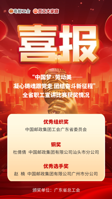 经广东省总工会专家评委评审,省邮政工会荣获优秀组织奖,汕头市分公司杜倩倩获铜奖,广州市分公司赵楠获优秀选手奖!