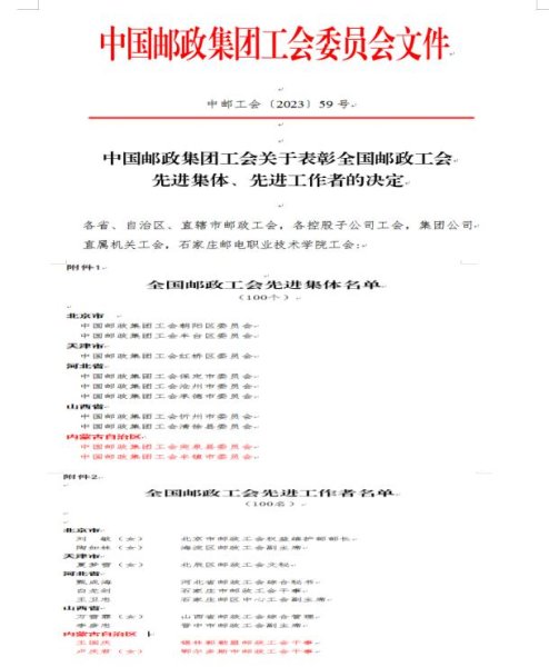 为表彰先进,树立典型,近日,中国邮政集团工会决定,对全国邮政工会100个先进集体和100名先进个人进行表彰,我区共有2个单位,2名个人上榜。其中,中国邮政集团工会突泉县委员会、中国邮政集团工会丰镇市委员会被授予“全国邮政工会先进集体”荣誉称号,锡林郭勒盟邮政工会干事王国庆、鄂尔多斯市邮政工会干事卢庆君被授予“全国邮政工会先进工作者”荣誉称号。
