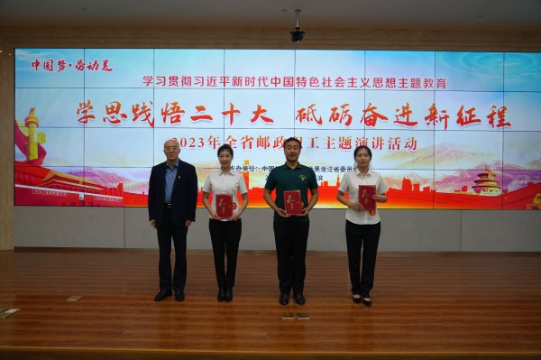 2023年9月26日,为学习宣传贯彻党的二十大精神,迎接中国工会十八大的召开,黑龙江省邮政工会在哈尔滨举办了2023年全省邮政职工“中国梦·劳动美——学思践悟二十大 砥砺奋进新征程”主题演讲比赛活动。全省各级邮政工会高度重视、精心组织,经过层层选拔,来自全省邮政14个代表队的26位演讲选手参加了党的二十大知识现场问答,展开了激情澎湃的演讲角逐。经过评选,3名职工荣获一等奖、5名职工荣获二等奖、8名职工荣获三等奖、10名职工荣获优秀奖。省邮政工会评选出哈尔滨、牡丹江、大庆、鸡西、伊春、大兴安岭地区、省分公司机关工会7个邮政工会为优秀组织奖。同时,省邮政工会将在“黑龙江邮政”公众号上择优展播获奖选手演讲视频。