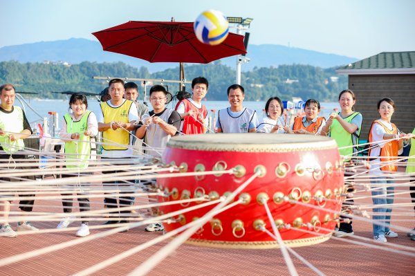最后在“百人大鼓”游戏中,每个人都拉动一条绳子,合力将球颠起来,通过大家的努力,最终突破了20个。共同完成的时刻大家都兴奋得跳了起来。游戏环节结束后,晚上的音乐晚上中,大家争先恐后展示着才艺。有跳舞、唱歌、小品等,让现场的气氛推向了高潮。大家时而捧腹大笑,时而感动落泪。最后在《真心英雄》的大合唱中结束了本次活动。