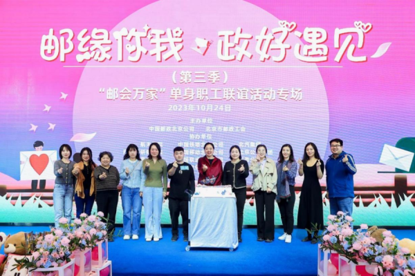 为贯彻落实中国工会十八大精神,当好职工“娘家人” ,办实工会“暖心事”,更好服务单身青年职工、搭建婚恋桥梁,使他们尽快走向婚姻殿堂,10月24日,北京市邮政分公司、北京市邮政工会携手航天三院、商务部研修学院、宋庆龄青少中心、北汽集团、北京公交集团、水科院、中国移动北京公司、中国电信北京公司、中国铁塔北京公司 、中国联通北京公司、双秀公园等11家单位,在中国宋庆龄青少年科技文化交流中心举办“‘邮’缘你我 ‘政’好遇见”第三季邮会万家单身职工联谊活动,来自12家单位的100余名单身职工参加活动。