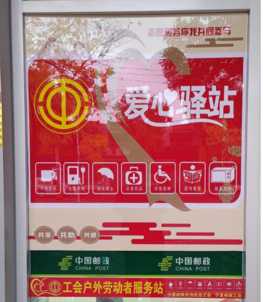 城市的发展离不开劳动者的辛勤付出,为扎实落实“我为群众办实事”工作。近日,中卫邮政工会结合工作实际,对沙坡头区、中宁县、海原县临街靠路、交通方便的网点场所各建造了2处“户外劳动者服务站点”,全市共建6处,进一步解决了环卫工人、快递小哥、外卖小哥、出租车司机、交通警察等户外劳动者“吃饭难、喝水难、充电难、休息难、如厕难”等现实问题。