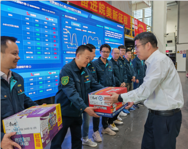 在“双十一”旺季攻坚战来临之际,合肥邮区中心党委和工会组织时刻牵挂着一线员工。自11月1日起,中心党委班子成员及工会部门负责人分别在中心皇藏屿、蜀山邮件处理场地开展旺季生产暖心关爱活动,为大家送去牛奶、方便面等慰问品,对奋战在“双十一”前沿的员工表示亲切的问候和真诚的关怀。 中心党委书记钱志雄在蜀山场地生产现场与员工亲切交谈,了解旺季生产情况、员工生活情况及心理状态,强调场地所属各级工会组织在旺季期间要做好“流动之家”服务,保障好员工的身心状态。 中心副总经理钱广发在省运输中心办公场地慰问一线邮运驾驶员,对旺季期间坚守在工作岗位的驾驶人员表示感谢并送上慰问物资,叮嘱大家一定要注意安全,并鼓励大家要以饱满的工作热情、昂扬的精神状态做好业务旺季邮件运输工作。