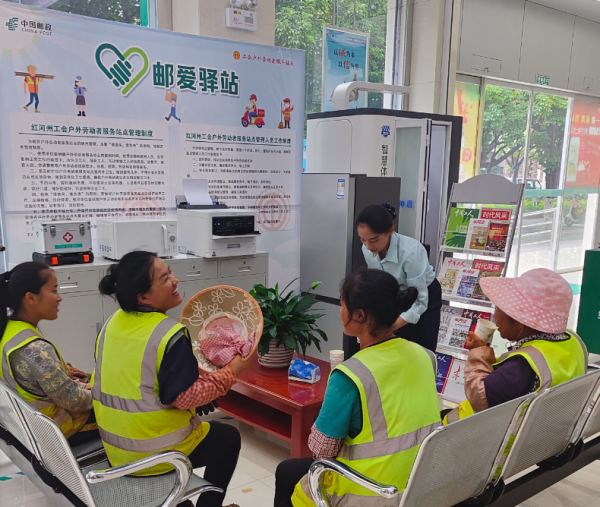 7月份起,云南邮政在全省范围内开始建设“邮爱驿站”,各级邮政分公司主动与当地总工会汇报,在选址、建设内容、宣传上下足功夫。建站以来,“邮爱驿站”结合网点物理环境,添置冰箱、微波炉、饮水机、充电线、书报及电子阅读、急救小药箱、针线包等设施,切实解决户外工作者吃饭难、喝水难、休息难的问题,同时充分整合邮政金融、寄递、邮务资源,进一步拓展网点服务功能,积极主动与合作邮商对接,借助资源,为户外工作者提供爱心义诊、暖心早餐、送菜送水票等特色服务。