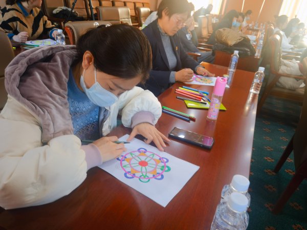 潘芙蓉老师先着重讲解了《家庭教育促进法》的相关条款,老师精彩解说后,采取有奖问答的方式,激发广大员工的参与热情,大家争先恐后纷纷举手抢答,掀起一阵阵学习高潮。每个桌子上摆上了五颜六色的绘画笔和曼陀罗图案画纸, 潘芙蓉老师为大家介绍了曼陀罗绘画体验活动的意义。曼陀罗的绘画方式分为三种:意向曼陀罗、自性曼陀罗和涂色曼陀罗,涂色曼陀罗模板设计含有积极意义,潜意识被植入和谐、积极、美好的象征元素,净化心灵,绘画者遵循内心感觉涂抹颜色。每一个图像,都属于内心的幻象,这幻象正如我们的梦,如果你对自己的梦记录下来,你会发现你的梦里面有很多奇奇怪怪的意象,所以曼陀罗有一种自我治愈的功能,不需要心理咨询师,自己治疗自己。