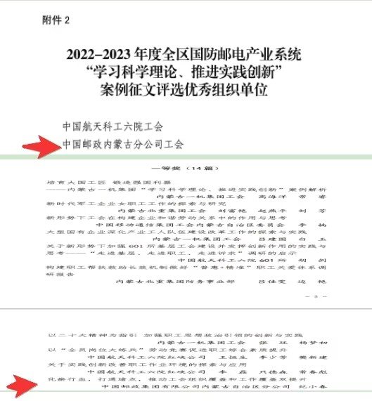 12月11日,内蒙古自治区国防邮电工会组织开展的“2022-2023年度全区国防邮电产业系统‘学习科学理论、推进实践创新’案例征文活动”评选结果出炉,内蒙古邮政工会获评“优秀组织单位”,选送的作品《化瘀行血,打通堵点,推动工会组织覆盖和工作覆盖双提升 》获评一等奖。