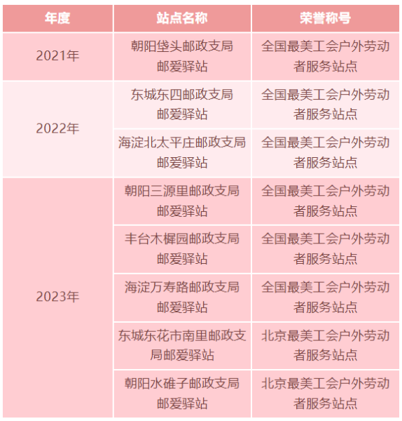 据悉,在2023年全国总工会和北京市总工会开展的“最美工会户外劳动者服务站点”活动中,北京邮政3个“邮爱驿站”被评为全国“最美”,2个“邮爱驿站”被评为北京市“最美”。至此,在2021-2023年的评选活动中,北京邮政共有6个站点获得全国“最美”荣誉称号,2个站点获得北京市“最美”荣誉称号。