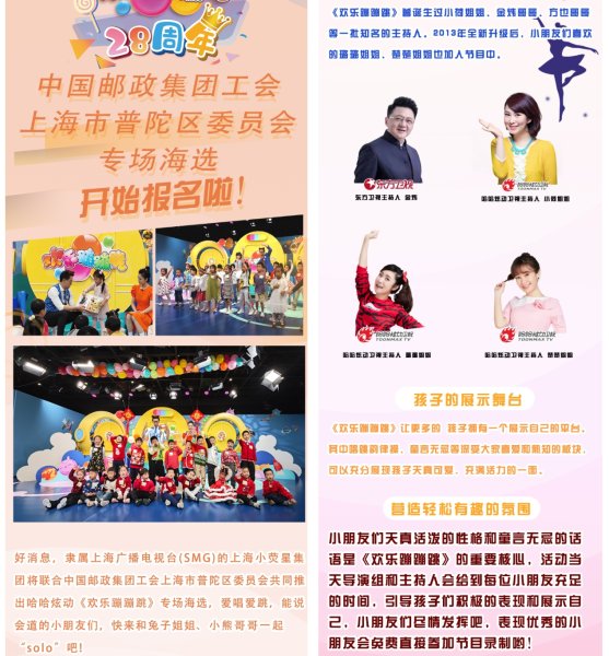6.1儿童节临近,为丰富员工活动和企业文化娱情,普陀区分公司工会从关心员工生活幸福度;关注员工家庭和谐氛围为出发点,为邮政员工和子女提供亲子活动互动交流、员工家庭才艺风采展示舞台。2024年5月中旬,普陀区分公司工会联合上海广播电视台小荧星艺术团,开设"欢乐蹦蹦跳"海选专场,为分公司员工家庭的宝贝们提供才艺展示及交流活动的平台。