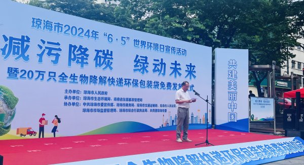 活动中,琼海市分公司丁小丰总经理作为企业代表上台发言,向全市邮政快递企业发出绿色包装倡议,并承诺琼海邮政将认真履行倡议内容。