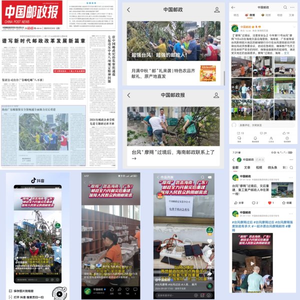 海南省邮政分公司、邮储银行海南省分行,广东省邮政分公司、邮储银行广东省分行及时传达习近平总书记重要指示精神和李强总理批示要求,积极落实地方党委、政府有关台风防御工作要求以及集团公司党组书记、董事长刘爱力等领导的部署要求,立足于早准备、早安排、早部署,提前下发防范台风工作的紧急通知,落实做细各项防台防汛措施,全力保障邮政员工生命财产安全和邮政生产安全平稳运行,实现人员零伤亡、邮件零损失,确保金融服务“不断档”,扎实做好灾后恢复重建工作“后半篇文章”。台风过后,海南、广东邮银立即开展生产自救,并开放营业网点供群众休息、充电、上网、报平安,积极参加地方抢险救灾工作,为灾后恢复重建贡献力量。