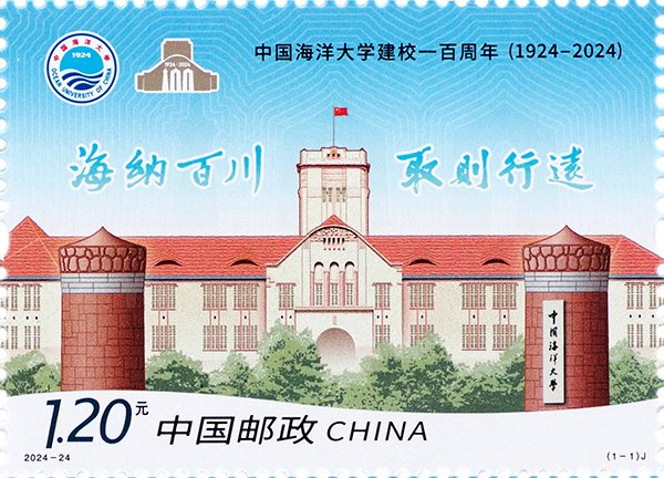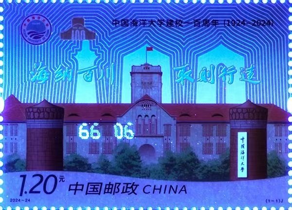 中国海洋大学始建于1924年,是一所具有鲜明红色基因、优良革命传统、执着蓝色梦想的国家重点建设的综合性研究型大学。建校百年来,中国海洋大学始终秉持“教授高深学术,养成硕学宏材,应国家需要”的创校宗旨,坚守“崇尚学术、谋海济国”的价值追求,把服务海洋强国建设作为特殊使命,在科教兴国、海洋强国建设中勇立潮头、走在前列。 本套邮票采用高精度胶版工艺印制,邮票图案使用黑、蓝、红、黄、金、光油六色油墨印刷。整体色彩搭配精准饱和,色彩渐变自然流畅。边饰上的色标圆点,巧妙地融入了海洋大学的金色LOGO元素设计印制。 邮票左上角,金色的校徽LOGO熠熠生辉,主体建筑窗户的细腻勾勒,皆由金墨印刷点缀,彰显历史的厚重与辉煌。 邮票背景中的洁白线条、“100”这一历史性数字的巧妙呈现,以及校训“海纳百川 取则行远”的校训文字,连同右下角熠熠生辉的“中国海洋大学”牌匾,均采用了独特的光油发白荧光油墨印刷。不仅使得邮票在日光下发出夺目的光彩,更是在紫外灯光的观察使人“眼前一亮”,仿佛百年学府的历史光辉穿越时空,跃然纸上。