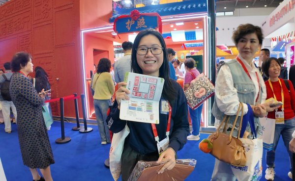 刚完成护照打卡任务的吴波女士兴奋地说:“我是在小红书上看到可以预约领取护照的活动,今天特地跑了8个展馆,终于把戳都盖齐了,来到消博邮局领取到这个礼品很开心,感谢中国邮政给我们提供了这么好的打卡机会。”