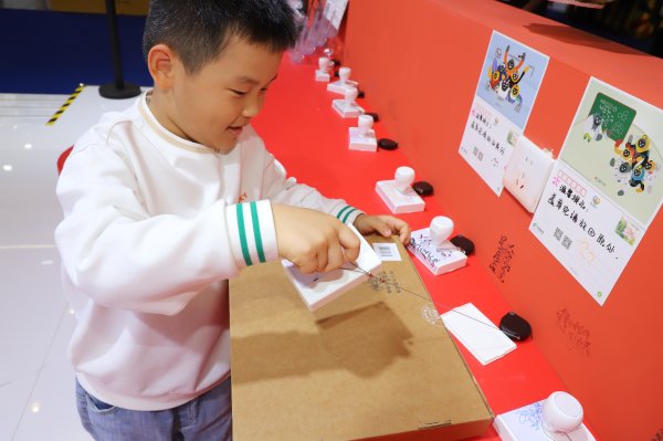 今年5岁的师然小朋友已经是消博邮局的“常客”,非常喜欢盖戳打卡活动,他认真且专注地一遍又一遍在纸上试盖纪念戳,直到满意后,才正式在《第五届中国国际消费品博览会纪念封》上加盖。他和妈妈说要把这枚纪念封寄给在儋州洋浦的奶奶,这将是他第一次寄信。