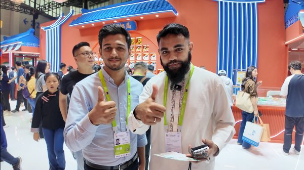 来自巴基斯坦的观展商Waleed Abdullah先生和Ammar Cheema先生一起在消博邮局的盖戳区仔细观看、研究大家如何盖戳,之后才动手尝试。 “第一次尝试盖戳,这个活动很有意义,非常好。” 他们边说边竖起大拇指。