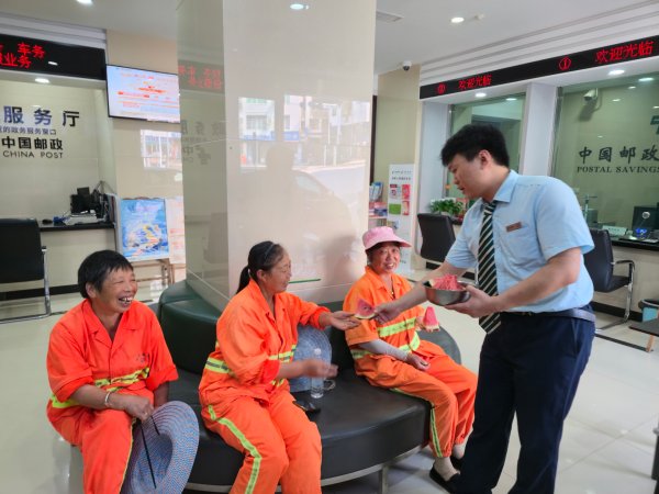 在这里,环卫工人可以在忙碌的工作之余,走进邮政大厅,享受空调带来的丝丝凉爽。驿站还为他们精心准备了西瓜,让他们在炎炎夏日中能够消暑解渴。中午时分,驿站提供的微波炉加热服务,让从家里带来饭菜的他们能吃上热乎的饭菜。除此之外,“邮爱驿站”为大家准备了齐全的防暑物品,以应对可能出现的中暑情况。这些小小的举动,如同夏日里的一股清泉,滋润着户外劳动者的心田,让他们在辛勤付出后能够感受到社会的关爱与尊重。