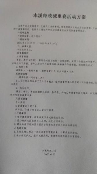 为相应国家“体重管理年”三年行动,让大家拥有健康身体,本溪邮政工会开展了为期2个月的职工减重比赛,吸引了90余人名职工参与此次活动,工会为每位参赛职工建立了健康档案,督促大家减重。