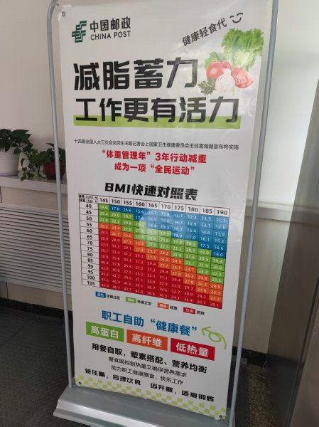 为了配合本次活动,本溪邮政工会在食堂立BMI快速对照表宣传版,让职工们及时了解自己的身体状况。同时食堂每天中午特别为职工提供减脂餐,每天的减脂餐都不重样。鸡胸肉、蔬菜、糙米饭等。合理搭配减脂餐,既让职工吃饱也要保证职工营养摄入。