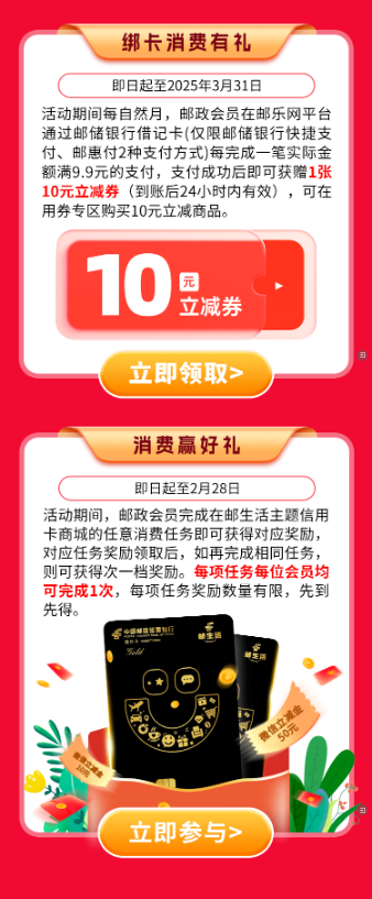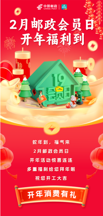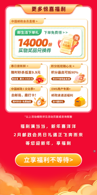 超多立减金、无门槛券、实物奖品齐发!2月邮政会员日福利放送开门红!