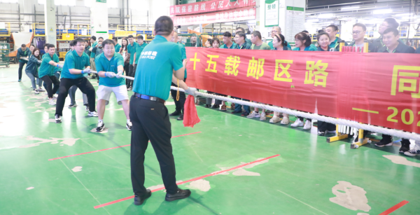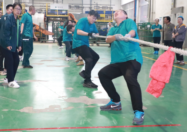 12 时整,“各就各位—预备— 开始!” 随着裁判一声哨响,小组赛首战正式打响。只见双方队员双脚蹬地、身体后倾,双手紧握麻绳,每一张脸庞都写满坚毅。“加油!加油!”场边观众的呐喊声、助威声此起彼伏,有的员工挥舞着双手,有的踮起脚尖紧盯赛场,甚至忍不住跟着队员的节奏一起发力,整个运动场瞬间变成了热血沸腾的海洋。