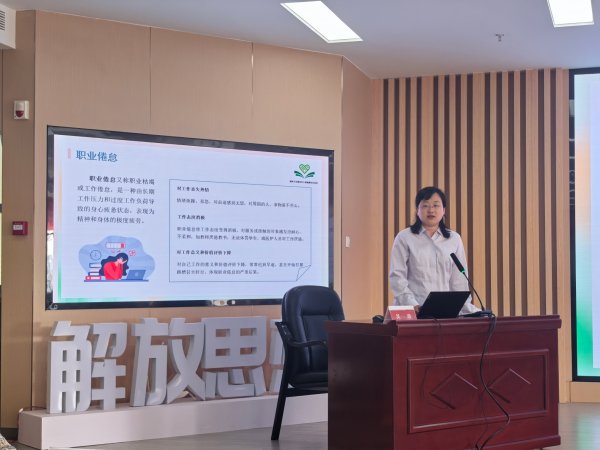讲座的主题是《职业人群心理健康的维护与促进》,主讲老师是来自空军军医大学西京医院心身科副主任吴迪。讲座内容包括职场中常见的压力、抑郁、焦虑等常见的心理问题及处理,分析了各种情绪、心理的区别和调解的方法,用通俗易懂的语言和典型案例,为职工有效应对工作压力、保持良好心理状态提供了专业指导。