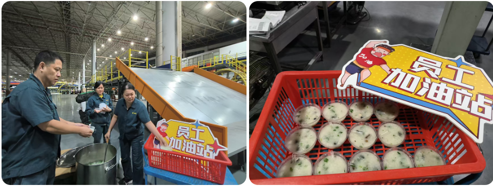 “双11”旺季期间,工会特别设立“员工加油站”:为江高、华陆、机北三个场院的夜班员工熬煮暖心甜汤、粥品,提供营养补给;为全体在职人员发放肇庆贡柑,并结合各单位值守团队实际需求,配备应急食品、抗疲劳饮品及外用药品等物资,全面保障员工在高强度工作下的身心健康。