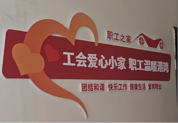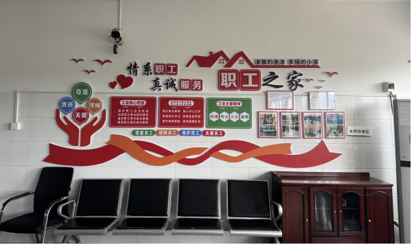 四是立足特色,坚持元素凸显“有归属”。在“阵地”上将工会标识悬挂外墙,强化“家”的辨识度和职工的归属感。内部精心设计的宣传展示板(政策文件、集体荣誉、职工风采、文明公约)以及滚动播放工会宣传片、培训课程、劳模工匠事迹、政策解读的移动电视,在空间营造“有归属”方面凸显工会元素,展现了浓厚的企业文化氛围,让职工直观感受到“家”的精神内核和工会作为,增强了认同感。