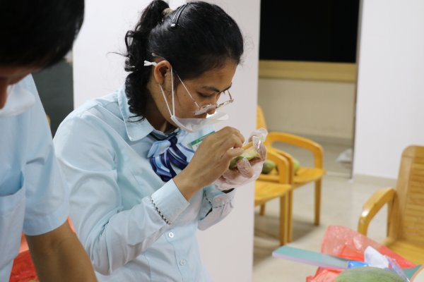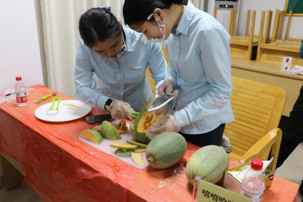 哈密瓜切盘创作环节堪称活动的“高光时刻”。30分钟的创作时间里,操作区里刀光流转,各队创意频出。顶瓜瓜队精心雕琢出“一路生花,扬帆起航”的作品,巧妙地将邮政元素与哈密瓜的香甜交融;邮递传香队打造的“传香万里”作品,借瓜块勾勒邮路,蕴意让乐东甜香传向世界;一刀定甜队则以整齐的摆盘和清晰的邮政标识吸引了众人的目光,展现出简洁而大气的风格。主持人实时暖场,一句“看这雕刻手法多细致”,瞬间将大家的注意力聚焦到作品细节,线下观众踮脚围观拍照,线上点赞量更是突破2万。