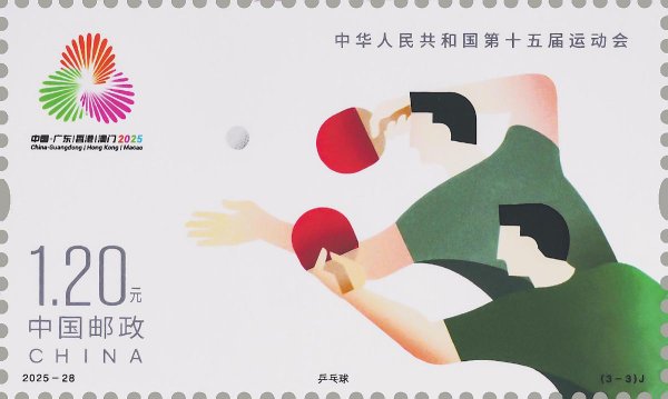 第十五届全运会是粤港澳三地承办的我国规模最大、水平最高、影响最广的综合性运动会,也是香港、澳门首次承办全国运动会。该套邮票由内地、港、澳三地设计师韩家英、陈幼坚、欧俊轩设计。第1枚邮票表现内容为花样游泳,邮票图案以跃动的剪影表现运动员的优雅身姿,力与美相生共舞,以独特的视角展现出运动员在水中的灵动瞬间。第2枚邮票表现内容为击剑,邮票图案以飞动的线条表现运动员迅猛矫健的身姿,刚与柔交织碰撞,以极简的构图展现出运动员激烈的对抗场景。第3枚邮票表现内容为乒乓球,邮票图案以鲜明简练的色块表现运动员蓄势待发的专注之姿,强与韧相融并济,以几何化、概括化的现代极简插画造型,展现出运动员发球瞬间的气势和张力,营造出紧张的比赛氛围。