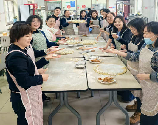 员工们齐聚食堂,分工合作包饺子,现场气氛热烈,大家分工协作、各显其能,有揉面、擀皮的,有调馅、包饺子的,大家手里忙活着饺子、嘴里畅谈着冬至,每个人脸上都洋溢着幸福的笑容。每个人包饺子的熟练程度和手法各不相同,但奉献爱心、助力旺季发展的行动是一致的。人多力量大,不一会儿一个个、一排排形态各异的饺子摆满了一盘又一盘。