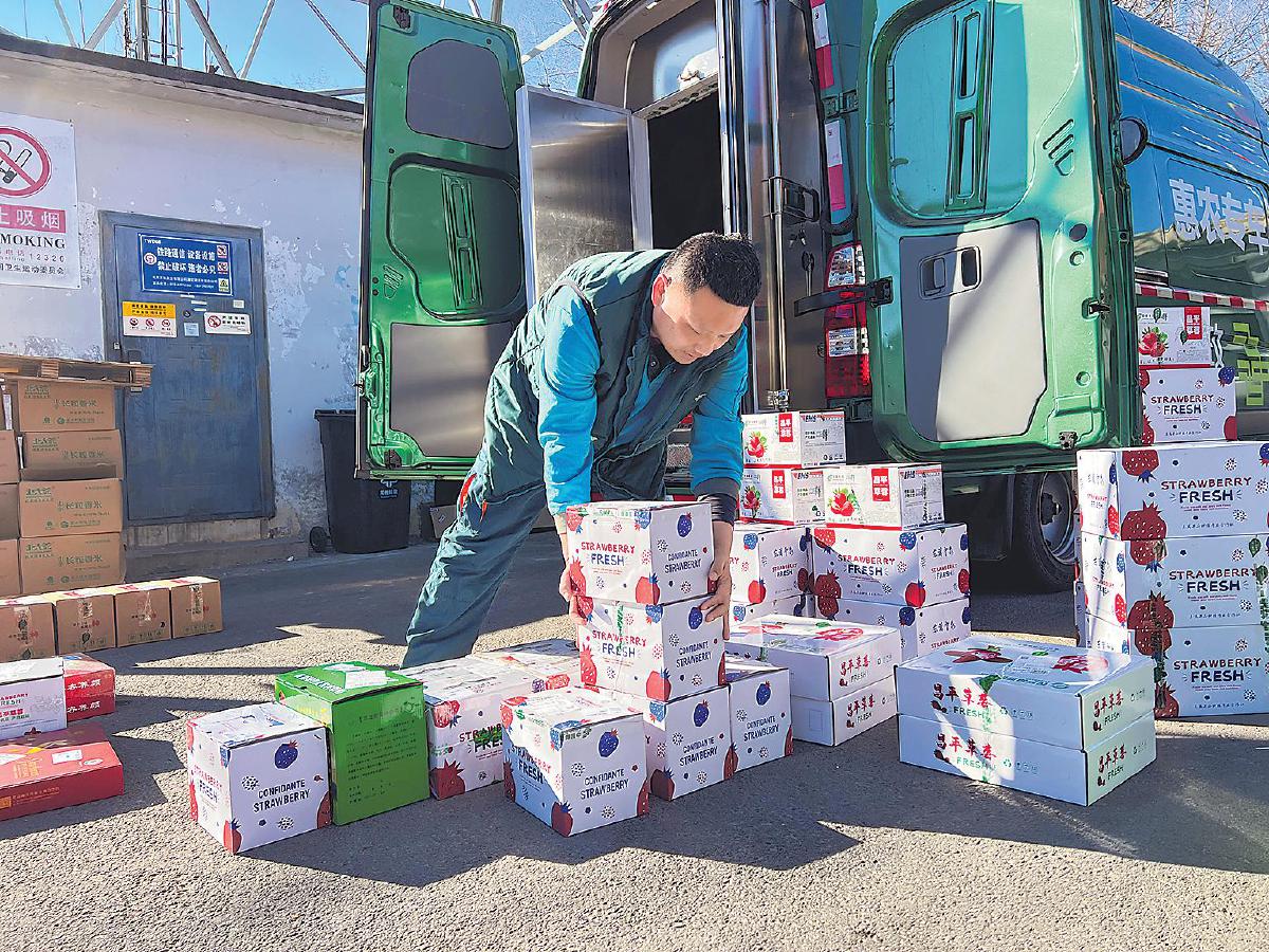 昌平邮政揽投员将刚采摘的新鲜草莓送上邮车。□温佳骏 摄