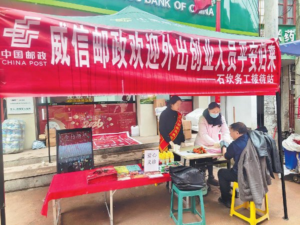 2月10日,云南省威信县邮政分公司设立接待站,为返乡人员提供义诊服务。 □郑森互 摄