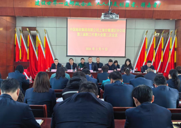 2026年3月9日,中国邮政集团有限公司上海市青浦区分公司第三届职工代表大会第二次会议召开。本次大会以全面贯彻落实党的二十大、党的二十届历次全会精神,认真落实以职工代表大会为基本形式的企业民主管理制度,总结2025年工作,部署2026年任务。团结动员广大邮政干部职工,为开创青浦邮政高质量发展而努力奋斗。