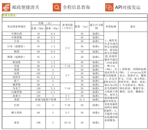 国际e特快是为适应跨境电商寄递需求而设计的一款高端跨境电商物流产品,在内部处理、转运清关、落地配送、跟踪查询、尺寸规格标准等各方面均有更高要求,是提高跨境卖家发货效率,提升客户体验,协助店铺增加好评提升流量的重要服务品牌。