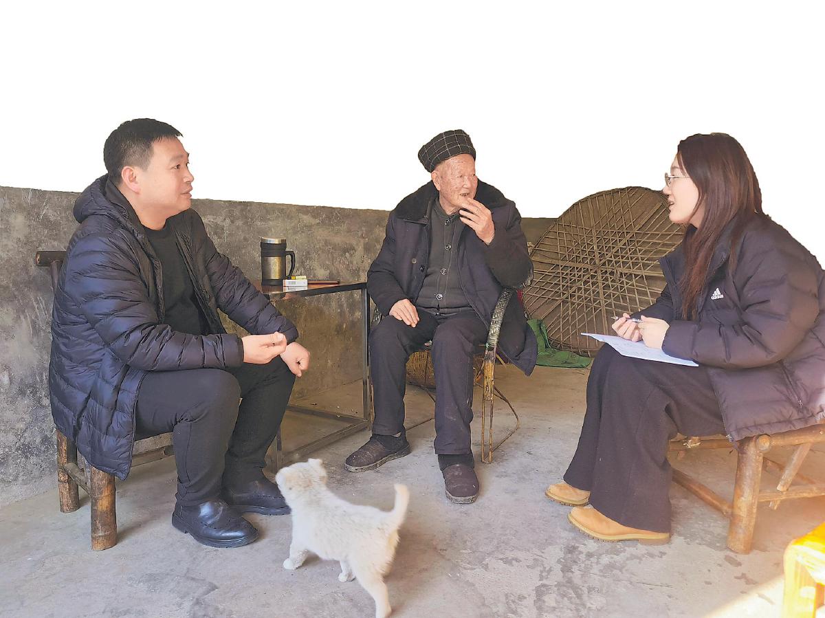 记者(右一)在农户家中采访。□肖婵 摄