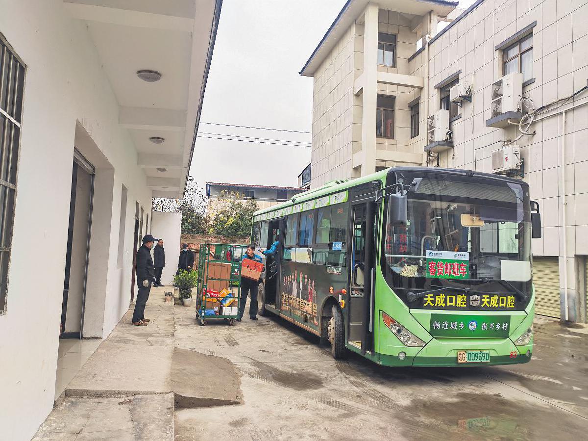 在枞阳县会宫镇农村电商运营中心,邮政投递员卸下公交代运的邮快合作邮件。